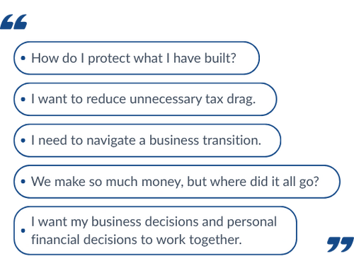 Before we talk tactics, we start by clarifying what matters most in this season of life and business. That conversation becomes the foundation for financial decisions; so strategy is shaped by purpose instead of reacting to whatever feels urgent in the moment.
